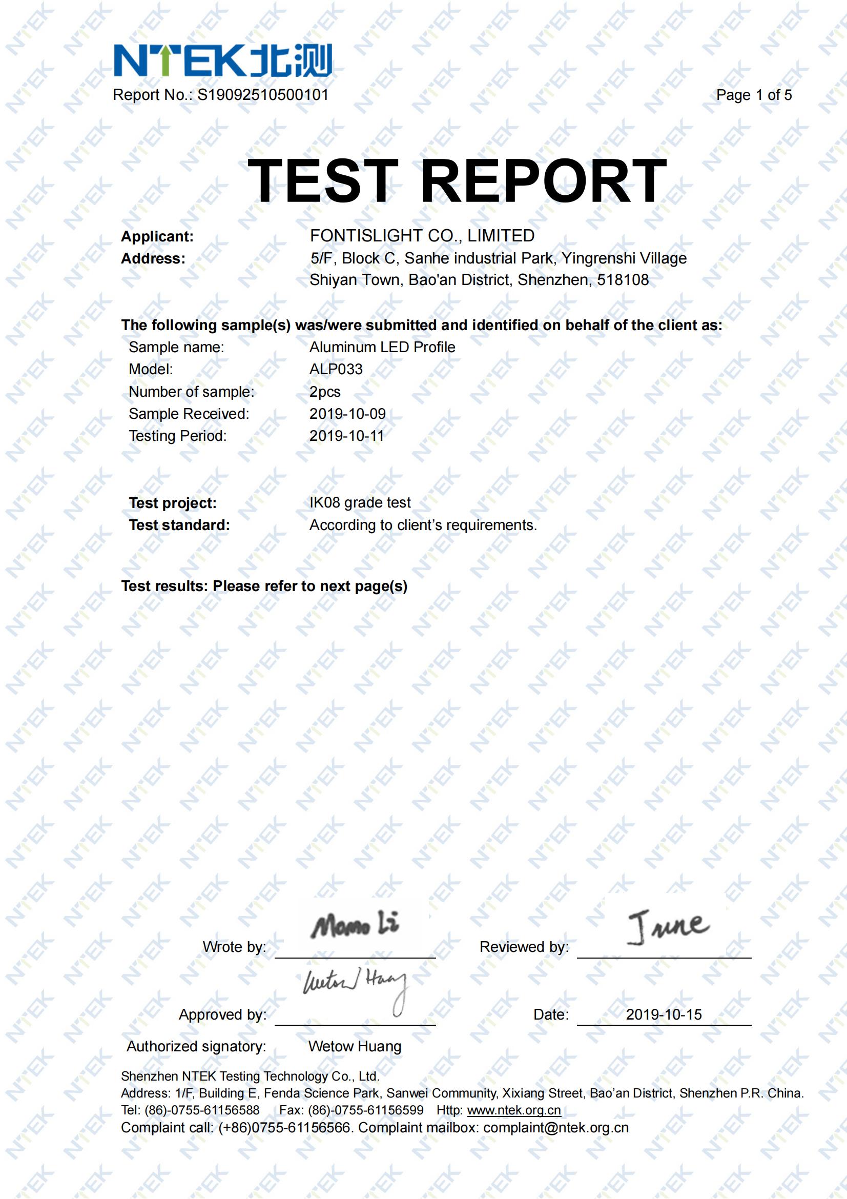 IK8 Test Report - Aluminum LED Profile