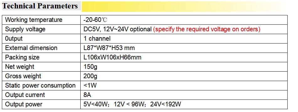 Output Power: 5V <40W, 12V<96W, 24V<192W;