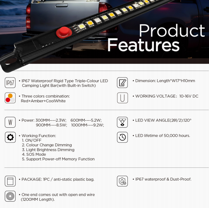 • 300/600/900/1000mm Waterproof LED Camping Canopy Light Bar (with In-built Switch)• Tri-colour: White+Red+Orange