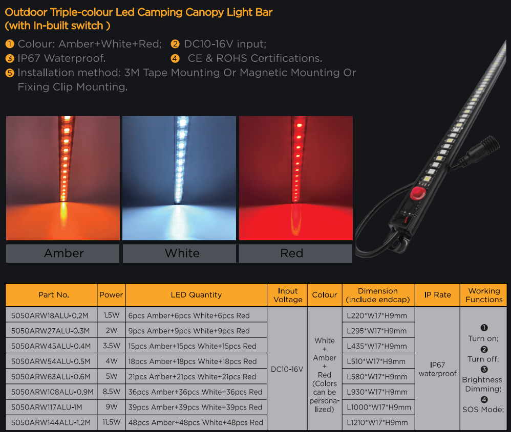 • L285/540/965mm LED Camping Canopy Light Bar (with In-built Switch)